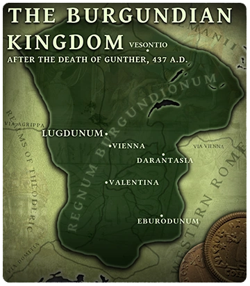 "O' legendary Gunther, grand ruler of the Burgundians and commander against the Huns! You led the fragile Burgundian people across the Germanic expanse and into the lands of Rome, where a falling empire gave rise to your and your brethren's kingdoms. Although but a lowly subject of Jovinus, the Emperor of the West, you worked with the Alans and the Eastern Goths to estable a safe haven for your people, in spite of Roman and Hunnic threats. At the old towns of Borbetomagnus and Ludgdum, you rose from the earth thriving cities of religion and culture, becoming the centre of the Christian West for centuries to come. Ultimately, you would fall at the hand of the Roman general Avitus and his band of Hunnic mercenaries, but your exploits would form the centre of many centuries of literature and folklore, even when your kingdom was lost to history.