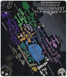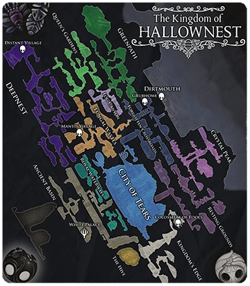Hallownest is the kingdom in which the game Hollow Knight takes place. Once ruled by the Pale King, its seemingly immortal god-king, the kingdom has fallen into ruin by the time the player encounters it. The land of Hallownest covers a vast network of caves and tunnels in the middle of a wasteland. They are inhabited by both sentient and wild bugs, among other creatures.