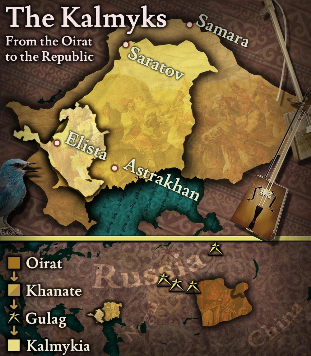 The Kalmyks are a Buddhist people in Europe with Mongolian ethnic ties dating back to Oirat in Dzungaria. They created the Kalmyk Khanate in 1635 in modern day North Caucasian Russia. Through emigration and the rough history of the Kalmyk people under the United Soviet Socialist Republics, Kalmyk communities have been established in far-flung places like the United States and Czechia.